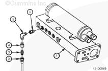康明斯QSK19 壓力軟管和單向閥安裝,找到并拆下機油泵法蘭底部的螺塞。用一個 5/8-12 直螺紋 O 形圈 x 1/2 美國國家標準錐形管螺紋 (NPT) 適配器更換。