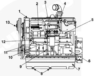 1齒輪室,2發(fā)動(dòng)機(jī)銘牌,3進(jìn)氣,4燃油泵,5燃油濾清器,6起動(dòng)馬達(dá),7油底殼,8放油口,9曲軸正時(shí)觸針端口,10機(jī)油尺,11減振器,12機(jī)油加注口/盤車裝置,13風(fēng)扇輪轂。