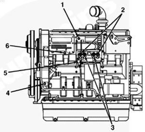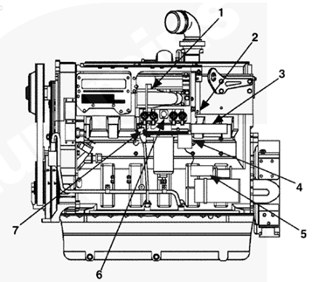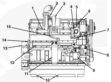 1排氣歧管,2渦輪增壓器機(jī)油進(jìn)口,3渦輪增壓器,4節(jié)溫器殼通風(fēng)口,5節(jié)溫器殼,6發(fā)動(dòng)機(jī)冷卻液出口,7冷卻液溫度傳感器,8水泵,9冷卻液濾清器,10發(fā)動(dòng)機(jī)放油口,11組合式全流/旁通機(jī)油濾清器,12機(jī)油冷卻器,13飛輪殼,14發(fā)動(dòng)機(jī)生產(chǎn)序號(hào)(ESN),15渦輪增壓器機(jī)油回油口。