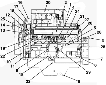 1渦輪增壓器進口接頭,2 ATA 跨接接頭,3組合式機油濾清器,4高壓燃油管,5冷卻液出口接頭,6吊耳,7飛輪殼,8放油口,9右排燃油泵,10風扇皮帶惰輪總成,11燃油進口管接頭,12加油管,13燃油供應泵殼,14風扇輪轂,15燃油濾清器,16冷卻液添加劑,17冷卻液泵,18燃油切斷閥 2(右排),19進氣歧管壓力傳感器 2(右排),20進氣歧管溫度傳感器 2(右排),21冷卻液進口接頭,22機油輸送管,23 Centinel 驅動器接頭,24 Centinel 油箱油位開關接頭,25充電機,26溢流閥,27燃油出口管接頭,28供油壓力傳感器,29供油溫度傳感器,