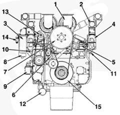 1渦輪增壓器進口接頭,2 ATA 跨接接頭,3排氣口接頭,4發(fā)動機轉速傳感器,5冷卻液出口接頭,6前吊耳,7飛輪殼,8曲軸箱通風裝置,9風扇輪轂,10充電機,11冷卻液液位開關接頭,12組合式機油濾清器,13燃油進口管接頭,14后吊耳。