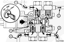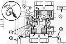 當鑰匙開關斷開時,Bosch® EHAB 裝置斷開,滑閥向相反方向移動。這樣可以防止燃油流入噴油泵油道并同時打開一條通路,使輸油泵將燃油從油道泵出并送回油箱。油道溢流口,燃油溢流,燃油從油道流至輸油泵,已過濾燃油流入,已過濾燃油返回油箱進口,