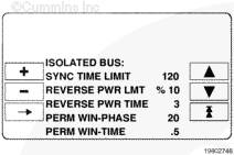 容許窗口時(shí)間 (PERM WIN-TIME):調(diào)整在 PowerCommand® 控制系統(tǒng)發(fā)出斷路器閉合信號(hào)前發(fā)電機(jī)組必須與系統(tǒng)母線保持同步的時(shí)間期限(單位:秒)。可調(diào)整的范圍是 0.5 至 5 秒。對(duì)于隔離母線的建議值是 0.5 秒。(將控制系統(tǒng)調(diào)整為更小的同步檢查窗口或更長的延時(shí)會(huì)造成同步時(shí)間延長。)