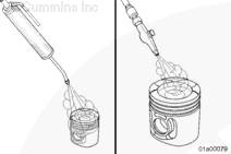 不要使用金屬刷。金屬刷會損壞活塞環槽。不要用玻璃噴丸清潔活塞環槽。可使用零件號為3822735的胡桃殼或塑料噴丸對活塞環槽和活塞頂進行噴丸處理。用最小的有效壓力,并且不要長時間集中噴射一個區域。塑料噴丸的推薦工作壓力是276 kPa [40 psi]。