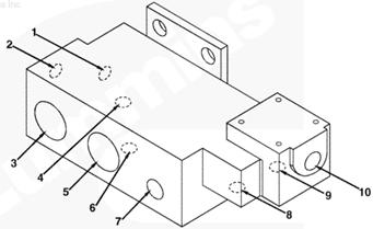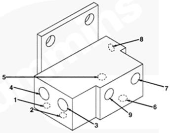 1右排歧管(零件號 3094906),2流至 EHAB 進口的燃油(抽吸未經過濾的燃油),3自右排噴油器回油管和噴油泵溢流管/EHAB(兩條管路)的回油,4自左排燃油歧管(右排供油)的燃油(抽吸未經過濾的燃油),5流至左排燃油歧管(自右排回油)的燃油,6自濾清器和左排燃油歧管的燃油(經過濾的增壓燃油),7流至左排燃油歧管(未經過濾的增壓燃油)和濾清器的燃油,8自輸油泵的燃油(未經過濾的增壓燃油),9流至噴油泵進口/EHAB 的燃油(經過濾的增壓燃油)。