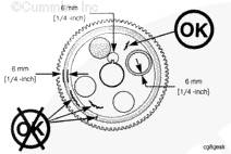 如果磨損超過 3 mm [0.125 in] 寬,則必須更換凸輪軸齒輪。