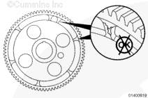 如果凸輪軸齒輪已更換,檢查噴油器正時;加工公差可造成正時超出技術規范。參考第 6 節中的步驟 006-025。安裝凸輪軸惰輪。確保所有的正時標記都正確匹配。