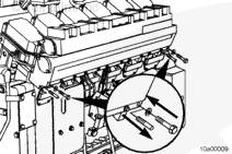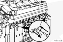 將密封墊和輸水接頭安裝到右排中冷器下部端口。安裝螺栓。扭矩值: 65 n.m [48 ft-lb]