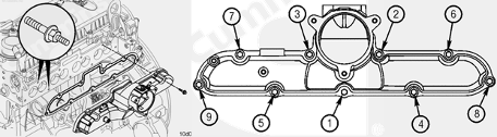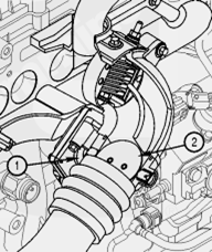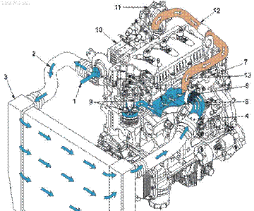 1至渦輪增壓器進(jìn)氣口, 2至空空中冷器的增壓后空氣,3空空中冷器,4節(jié)氣門(mén)執(zhí)行器,5進(jìn)氣管接頭,6進(jìn)氣加熱器,7進(jìn)氣歧管,8缸蓋進(jìn)氣口,9進(jìn)氣門(mén),10EGR 冷卻器,11EGR 閥,12EGR 跨接管,13至進(jìn)氣歧管的排氣,