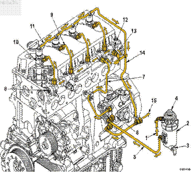 1、由油箱供油, 2、燃油濾清器,3、油水分離器放水口,4、手油泵,5、至燃油泵的燃油供應,6、高壓燃油泵,7、至高壓油軌的燃油供應,8、燃油油軌,9、向噴油器供油的高壓油管,10、噴油器,11、噴油器回油,12、高壓減壓閥,13、高壓減壓閥回油,14、燃油回油管,15、燃油返回油箱,