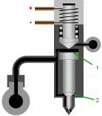 • 相同的燃油壓強施加在柱塞頂面 (1)和針閥凸臺區域 (2) 上