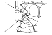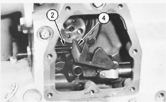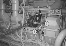 3.  Turn the governor or the actuator terminal shaft to the fuel ON position until the flat face of fuel stop lever (4) contacts synchronization pin (2). This is the synchronizing position or zero reference point. Hold the control linkage in this position when the injectors are adjusted.