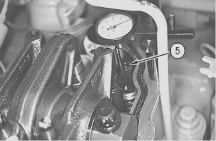 5. Apply a force of 5 N (1 lb) to 45 N (10 lb). Push down on the top contact surface of the valve bridge. Zero the indicator.稍微用力把氣門過橋( 4 )輕輕按下至到貼住氣門過橋的表面. 然后把千分表調至“0”位置.