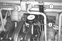 1.      Install the 145-5191 Gauge Support (1). Use the 147-2056 Dial Indicator or use the 147-5537 Dial Indicator. Use the 147-2057 Indicator Contact Point (2). Install the tool in the rear bolt hole. The rear bolt hole is located on the valve cover base.