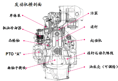 14 升降點,15曲軸箱呼吸閥,16 調速器,17 SAE護蓋,18調速輪,19 啟動馬達,20 廢氣渦輪增壓器,21鼓風機,22 排氣總管,23進氣口總管,