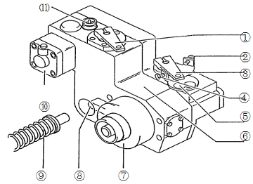 1.停車桿,2.高速限位螺釘,3.加速桿,4.怠速限位螺釘,5.滿負荷調速調整器,6.調速器殼體,7.調速器驅動齒輪,8.齒條控制桿,9.齒條及彈簧,10.LDA,11.加濃電磁閥