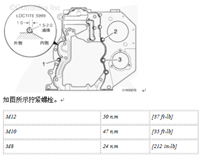 確保在指定的區(qū)域只涂有密封膠。如果不這么做可能會導(dǎo)致通向附件驅(qū)動裝置的油道發(fā)生堵塞,并且/或者造成油壓損失。這會導(dǎo)致發(fā)動機(jī)嚴(yán)重受損。
