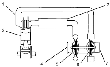 (1) 排氣岐管 (2)后冷器(3)發動機氣缸 (4)進氣口 (5)渦輪增壓器壓縮機葉輪(6)渦輪坩壓器堝輪葉鞋(7)排氣出口