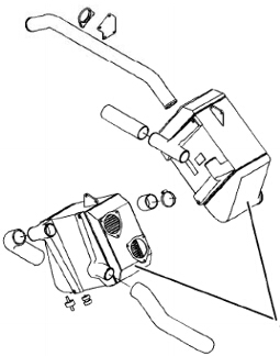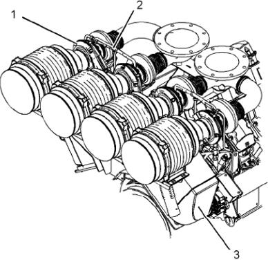 Perkins4016柴油發動機在發動機后端安裝了四個渦輪增壓器(1)。每個渦輪增壓囂的渦輪機側都連接至該渦輪增壓器的排氣歧管。每個渦輪增壓器的壓縮機側都通過管道與后冷器殼體相連。
