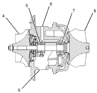 (4)壓縮機葉輪 (5)軸承 (6)機油進口 (7)軸承 (8)渦輪機葉輪 (9)出油口