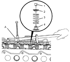 b.使用工具(A),壓縮Perkins1106A/C發(fā)動(dòng)機(jī)氣門彈簧(3)并使氣門稍稍開啟。