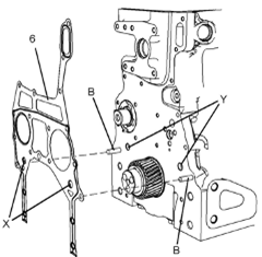 注:確保密封墊上的兩個圓形凸舌(X)與Perkins1106A/C發(fā)動機缸體上的兩個孔(Y)接合。