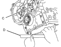 11.對準前Perkins1106A/C發(fā)動機機殼體(3)的底面與Perkins1106A/C發(fā)動機缸體的下加工面。使用工具(D)和塞尺,檢查前Perkins1106A/C發(fā)動機機殼體與Perkins1106A/C發(fā)動機缸體之間的對準。請參閱插圖144。更多信息請參閱《技術參數(shù)》,“前Perkins1106A/C發(fā)動機機殼體和蓋”。