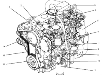 (1)前吊耳(2)出水口(3)后吊耳(4)燃油歧管(油軌)(5)電子控制模塊(6)燃細細濾器(7)水泵(8)機油加注口(9)機油表(10)機油取樣閥(11)機油濾清器(12)曲軸皮帶輪(13)傳動皮帶(14)皮帶張緊裝置