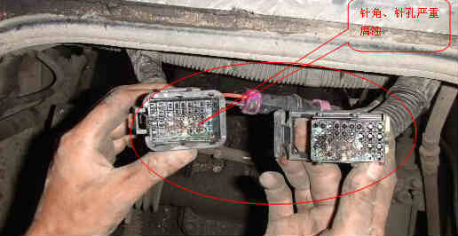 檢查水溫傳感器接插件,清除故障碼后冷卻水溫信號超高限故障不再出現,但是用檢測儀檢測到故障碼:“256指示燈1驅動線路故障”頻繁出現,玉柴電噴柴油發動機還是經常自動熄火,檢查玉柴電噴柴油發動機線束,發現線束42接插件進水,針腳已嚴重腐蝕,見圖5,