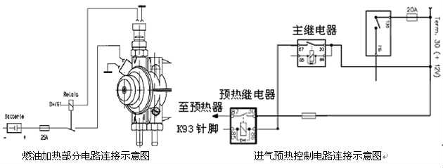 在低溫環境下,汽車鑰匙開關上電后ECU會根據當前溫度決定是否需要進氣預熱和預熱時間,然后通過K93腳輸出命令給進氣預熱繼電器控制加熱器的開啟關閉。同時ECU也會根據當前環境對起動性能進行低溫提前角油量以及軌壓的補償,提高其冷起動性能。由于高壓泵CP1H正常工作的燃油溫度介于-25℃~120℃之間,因此為保持高壓泵正常工作,在低溫情況下燃油濾清器集成的加熱系統會啟用燃油加熱,在電噴柴油發動機運行狀態下,當溫度低于燃油加熱溫度時,燃油加熱開關啟用,停車時或燃油溫度升高到范圍之內時關閉燃油加熱功能,燃油加熱功能不受ECU控制。